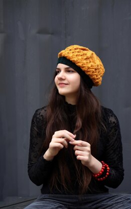 Dramatic beret featuring elegant fern lace motifs with optional two-color design and inner lining for reversible wear. Seamless construction creates striking highland-inspired texture.