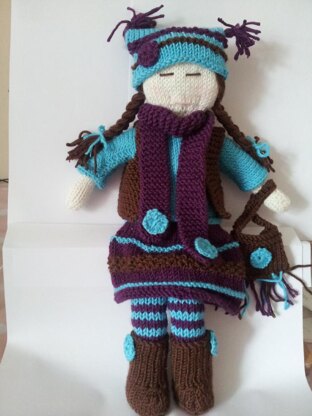 Material needed 3.25 mm knitting needles Yarn required ( any good quality dk yarn ) turquoise 50g dkCream 50g dk body purple 50g dkBrown 50g dk hair and boots