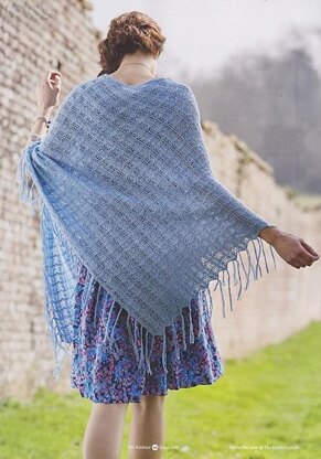 A fine, easy to wear cover-up with optional tassles for summer evenings and those cooler autumn days. Although this poncho is dressed to a square shape, the open lace pattern and relaxed neckline will allow it to drape over the body. Be sure to use stretchy cast on to allow the scallops to form at the cast on edge and stretchy cast off at all neckline shaping and final cast off, to allow the garment to conform to body shape.