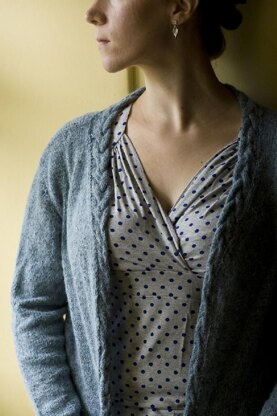 A cozy cardigan with integrated patterned pockets, a cabled edging, and a bit of a slope at the waist.