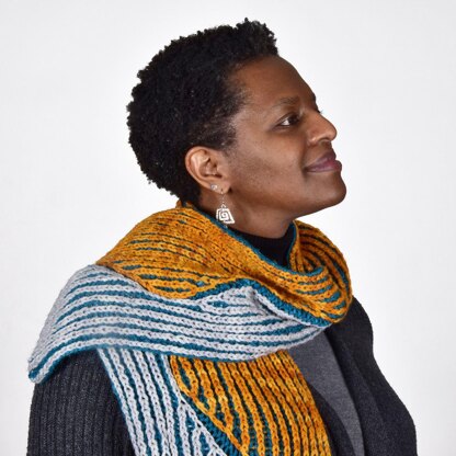 This project is a gentle introduction to brioche intarsia colorwork. The wavy colorblocking was inspired by the path a skier leaves in the snow as they make their way down a mountain.
