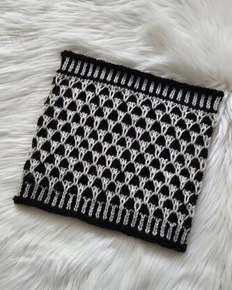 Do you see it? The mask? I’m not one for horror movies, but Scream is such a cult classic. Once I saw the ghost face, I couldn’t unsee it. Other than the corrugated ribbing, this slipped stitch design uses just one color at a time for an ultra-plush and squishy cowl. High contrast yarns are recommended to show off the pattern.