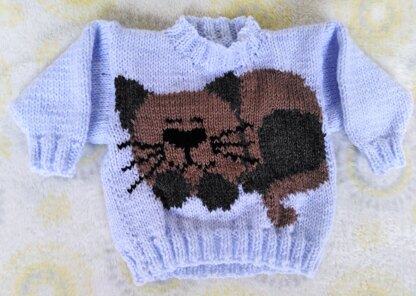 With a baby on the way I wanted to make some warm jumpers for keeping him snug when out and about. This jumper has a sleeping cat picture on the front which is worked in intarsia from a chart.