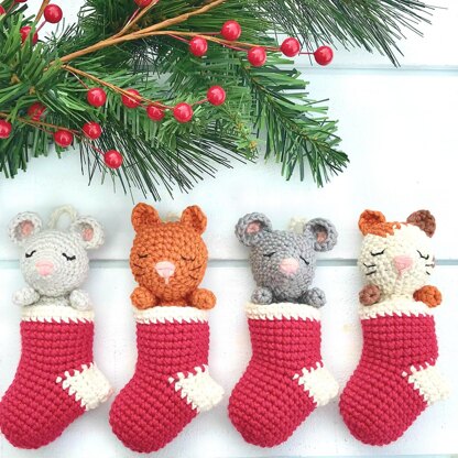 The Sleepy Stocking Stuffer Ornaments are my original amigurumi design. Your PDF purchase includes written instructions with a photo tutorial. You will receive directions for crocheting the stockings, mice, and kittens. You'll need the yarn colors pictured (worsted weight), a size E crochet hook, a yarn needle, stuffing, and an intermediate crochet skill level (or give it a try if you're an ambitious beginner!). The finished ornaments are about 6" tall.