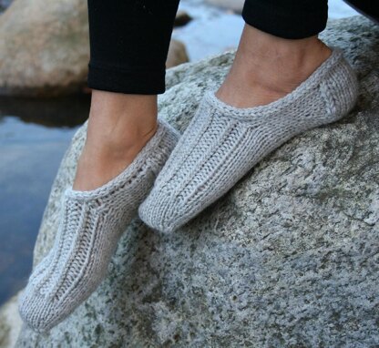 These slippers are knit from the toe up with the magic loop method of knitting in the round. Sport weight yarn is held double throughout the slipper.