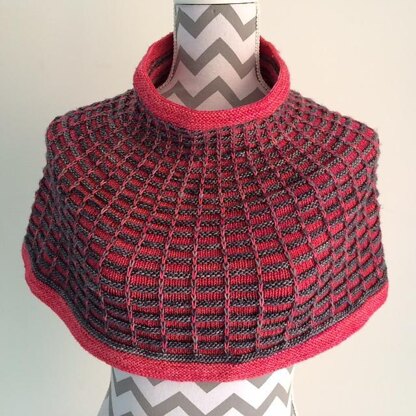 This capelet is shaped to create a lovely fit around the neck and shoulders. Try a bright colour with a muted neutral as I have or any two colour combination that takes your fancy. It is worked from the bottom up.