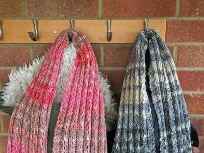 - The two scarves pictured were made using King Cole Drifter in shades Florida (shades of pink) and New Orleans (shades of grey).