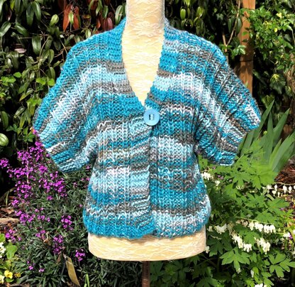An easy knit slouchy bolero in a super chunky yarn. A useful and stylish extra layer for your wardrobe. The main stitch is a wide rib with sleeves and front borders in garter stitch. Simple to lengthen too if you prefer it longer - just increase the length stated before working the sleeve shaping.