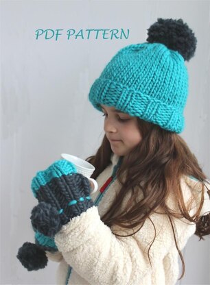 This set is cozy, comfy and filled with warmth. The hat is sized for children, teen/ SM adult and M/L adult. The glove pattern is sized for children and adults. The hat is knit in the round.