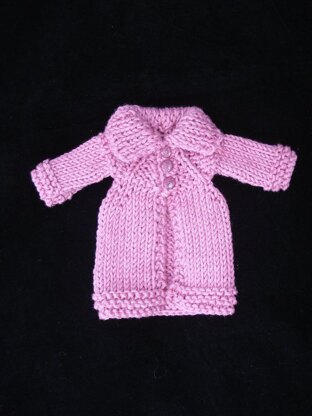 This is a lovely easy little coat to knit and looks fabulous in different types of yarn. It is knit in one piece so only has sleeve seams to stitch up. I have used Noro silk garden lite, bamboo and soya yarns, merino and handspun and they all look lovely! Fits Blythe doll loosely so she can fit a warm sweater underneath too :) You can make it as short or as long as you like! It can always be made starting at the yoke for the style in the bottom photo without a roll neck.