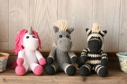 + To complete the Horse, Unicorn, and Zebra you will need: yarn in your choice of colors (about 108 yds of worsted/aran and 7 yds of fine for the unicorn horn), a size E/4 (3.5 mm) crochet hook, a size B/1 (2.25 mm) crochet hook for the Unicorn's horn, stitch markers, tapestry needle, stuffing, pins, scissors, chopstick to help stuff, 10mm safety eyes, and optionally embroidery floss and needle.