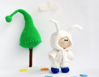 Small Boy Doll in the rabbit wear The toy is knitted round and that is why the pattern is recommended for Advanced Beginner Knitters. Really easy to knit.