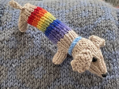 This striped Small Sausage Dog is a quick little knit to use up odds and ends of yarn. You could make one as a bag charm, key charm, or just as a sweet little toy. Designed by Amanda Berry @fluffandfuzz, this dog is knitted in acrylic DK yarns on single pointed needles (not in the round). For confident beginners and above, other techniques used include casting on and off, knits, purls, increases and decreases, and seaming to finish.