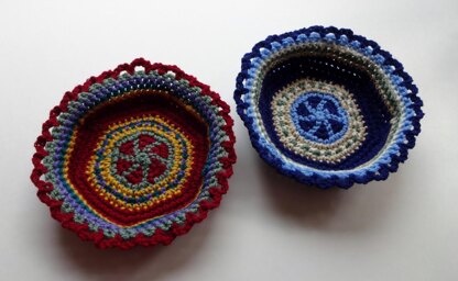This colorful petite basket utilizes the tapestry method of crochet, sometimes called intarsia. This pattern builds on some of my previous tapestry designs to create a unique and useful basket that measures about 6.5” in diameter across the bottom and about 2” high. The pattern calls for 5 colors and 2 color schemes are provided, but the color combinations are endless! Have fun and create your own color palette for any occasion, holiday, décor, or season. Match your home décor, or make a variety in fun colors to give as gifts for Christmas, Hanukkah, Birthdays, Mothers’ Day, Showers, and so many other occasions.