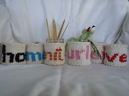 A last-minute gift for a fellow knitter, a cozy for a jar of marmalade, an extra special gift wrap for a special friend. Small rectangle worked in rounds or flat with four letter words knitted in fair isle technique. Words are charted; the pattern is written out for both work flat and work in the rounds. Words charted: Love, Home, Knit, Purl, Baby, Hope, Kind, Live, Kiss, Bake, Play, Yin, Yang, Trick, Treat.