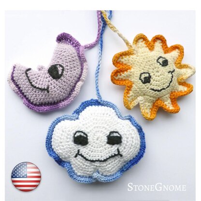 Babies love smiley faces and crackling sounds. The 3 shapes makes our little ones happy. Use them for a stroller toy or just for play. If you make them of heavy yarn and with a big hook, they can even be turned into small cute cushions.