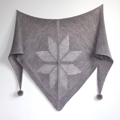 This wintery triangular shawl is a quick and fun knit designed for two skeins of fingering weight yarn. The center star is knit in the round, minimizing the use of purl stitches, followed by lots and lots of garter stitch. The pattern contains fully written instructions complimented with a chart for the center star. (It is not necessary to read charts.)
