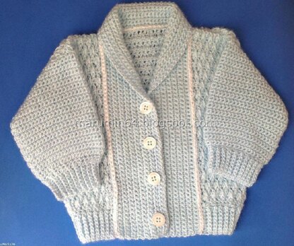 Worked in a nice "raised diamond stitch", this cuddly scmocking collared cardi is perfect as it is for a baby boy, but could as easily be worn by a baby girl adding a lacy edging to the collar. The pattern comes in two sizes: 0 to 6 and 6 to 9 months, and is available in both English and Spanish versions. A basic knowledge of front post stitches is required.