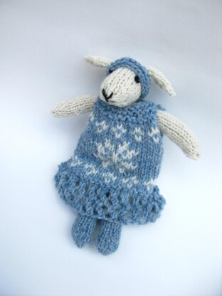 You will need a pair of 3mm and 4mm needles and a sewing up needle. The yarn used is DK weight. The bunny is knit in stocking stitch with some shaping. The dress has a lace border and a stranded knitting motif.