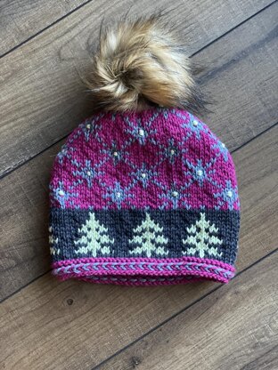 Four sizes are included. Infant, Child, Adult, Large Adult. Large Adult size shown in photos at left, Child size in photo on right.. Note: trees in hat on left were done with multiple scraps of green - see chart for more info. Never more than two colors on a round. Always choose size based on final circumference. Cascade 220 Superwash Aran used here