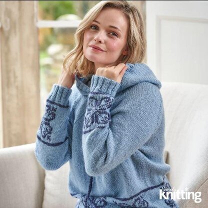This is a pattern for a snowflake border hoody, originally published in Simply Knitting. It is worked in stocking stitch with a Fair isle border, 2 x 2 rib edges. Photos Simply Knitting.