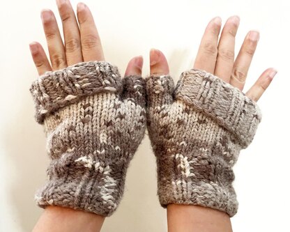 They are made with bulky yarn and a smaller needle size, so they knit up super quick and have a tighter stitch for a warmer pair of mitts.