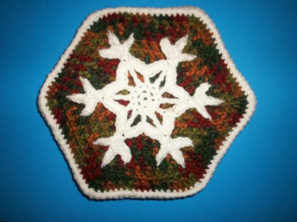 This neat snowflake pillow will make a great accent any place in your house, whether for Christmas or any time during the cold weather. It has a back zipper closure, so the cover can be removed for laundering. The sample was made with Red Heart yarn in the Fall Ombre. Pattern and instructions are also included for making the pillow form. This was designed to compliment my Snowflake Afghan (C-120).