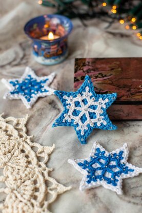 - Scheepjes Maxi Sweet Treat, size 10 crochet thread (100% cotton; 140 m (153 yds)/25 g (0.88 oz)), colours 215 Royal Blue and 106 Snow White, 1 g / 6 m / 6 yds for each snowflake.