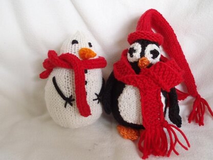 Make a snowman or make a penguin, instructions included for both adorable toys. They are knitted in the round, and don't forget the hat and scarf, it is cold outside. Finished Toy Size: Approximately 5” (15cm) Yardage: Snowman: 45 yards / 41 meters white yarn, 3 yards / 2.7 meters orange yarn, 25 yards / 23 meters red yarn (for scarf and hat). Penguin: 50 yards / 45 meters black yarn, 10 yards / 9 meters white yarn, 20 yards / 18 meters orange yarn, 25 yards / 23 meters red yarn (for scarf and hat).