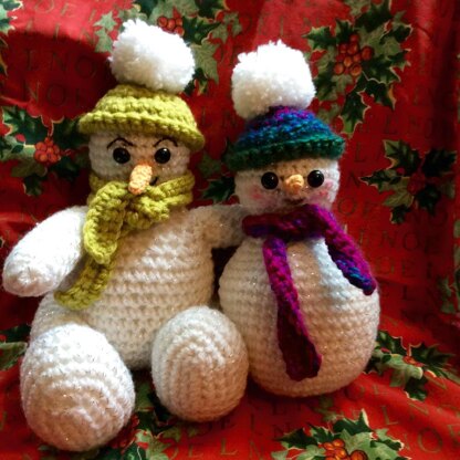 Cheeky Snowman just waiting to celebrate Christmas with you. He crochets up quickly and can be made as a stand alone snowman or with arms and legs. He is made in Chunky yarn using a 5.00 mm hook and measures approx. 9 inches (23 cm high). He uses one ball of Lion Brand Wool Ease Chunky Tinsel White (or 100gm of any Chunky White yarn) and 25gm of any other colour Chunky yarn for the hat and scarf. You will also need a small amount of orange cotton DK for the nose, thin black thread for the face and a pair of safety eyes.