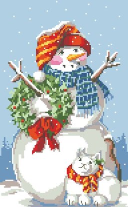 Designed by: Nancy Rossi. The weather outside may be frightful, but this fluffy snowman and kitten duo are delightful and want nothing more than to Let It Snow. With knitted scarves, a cheerful holly wreath, smiling faces, and rosy cheeks, this pair is a welcome addition in any winter wonderland. This simple and sweet holiday classic is one of our favorites.