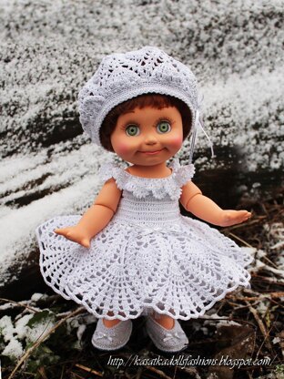 “Snowy Pineapple” is a doll clothes pattern to fit Galoob Baby Face-type dolls. The 17-page pattern contains instructions to make a dress, beret, pair of shoes and a tutu skirt as well as a technique tutorial for the beading technique used. Instructions are written out as row-by-row description with detailed explanations and progress photos (no charts).