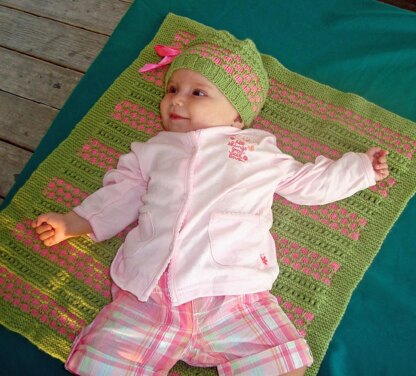 As seen in "1000 Fabulous Knit Hats" by Annie Modesitt EASY - really! A blanket with a matching little hat makes a sweet gift for baby. Garter stitch borders, slip stitch color patterns and easy eyelet rows combine to make a snuggly baby blanket. Instructions are given for two sizes of the hat. You choose to work from either the chart or the line-by-line instructions for the blanket.