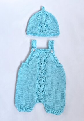 Snugglebug is a baby dungaree and hat set featuring a centre-front lace motif, worked following a simple lace chart. The dungarees are knitted from the bottom up: the legs are worked flat, then joined and continued in the round. Most of the garment is worked in the round with minimal seaming. The hat is knitted entirely in the round for maximum baby comfort and a seamless finish.