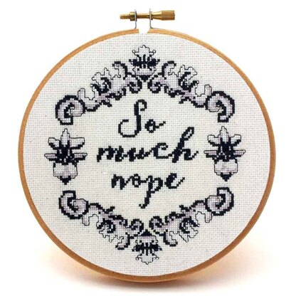 Have you ever wanted to say “no” to someone but in a much more expressive way? Now you can! This elegant vintage cross stitch pattern is inspired by antique French illustrations, but there’s nothing antique about the quote! When “no” just isn’t strong enough for you, switch it up with the sassy phrase “So much nope.” This lovely pattern has only three colours, so it’s very easy even for beginners to stitch. The pattern includes a full colour pattern and thread sorter. Model stitched on 14 count Fiddler's Cloth (Oatmeal Aida). Floss colours needed are (one skein of each): DMC Stranded Cotton - 310, 3866, and 452.
