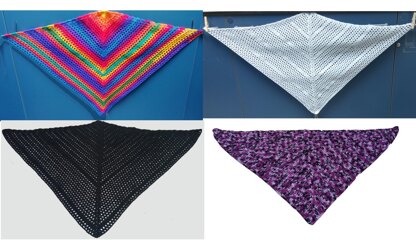 This shawl is pretty much as simple as it can be. I first made it to use a skein of pretty but quite fine yarn which came with a shawl knitting pattern that was driving me mad because it involved so much counting to get right that it could only be done if I was alone and in silence with no interruptions, so I was never going to finish it! I undid it and made up this simple crochet pattern to use up the yarn – it still made a rather small shawl. You can use any thickness of yarn you have, any colours, plain or shaded. 100g of DK is enough for a small shawl, the black one, enough for your shoulders, 200g of Aran makes the grey one shown.