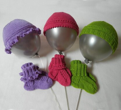 Questions on the pattern? Send me a Ravelry message, or email me at woolybearhandknits@yahoo.com. Perfect gifts for a baby shower - quick to knit baby hats with matching booties. Mix and match the edging, cuff, textured hat band, and textured instep to create a unique gift. Folded ribbed cuff helps keep booties on the baby’s feet. Directions also given for an untextured stockinette hat and instep. Shown: Purple -ruffled edge, purl welt hat band and instep Pink - picot edge, picot eyelet hat band and instep Green - ribbed edge, seed stitch hat band and instep