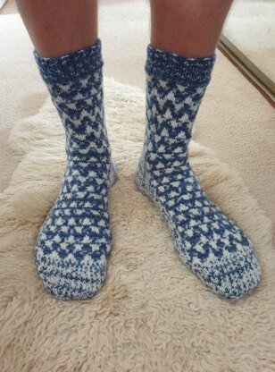 Socks are made up of simple geometrical shapes. The leg and foot are cylinders, the heel flap is a rectangle, the heel is a hemisphere, the gusset is a triangle, and the toe is a trapezoid! So to honour this discovery, I have designed this simple Triangles pattern. The triangles look fuzzy because their solid colour exactly matches the marled background, but you can create a sharper effect if you use a different combination. You could experiment with 2 solid colours - just be as creative as you want! The socks are knitted cuff down with heel flap. The heel, sole and toe are worked with 2 strands of yarn held together on alternate rows, so creating a lovely thick, comfortable sole to walk on with reduced chance of wearing through. Instructions are given in 3 sizes: slimmer foot woman/teenager; average foot woman/slim man; and broader foot/average man.