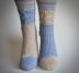 These top down socks have stripes, lace, texture and mismatch in a tonal way. Add an underfoot gusset for shape comfort plus soft yarn and you have an interesting and pretty knit.