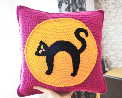 Black cat and full moon cushion. A great idea to decorate your house this Halloween. The pattern is written in English and uses UK crochet terms.