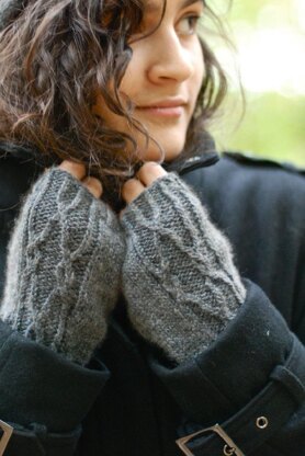 Sofie's Mitts are simple fingerless mitts with just a touch of twisted cables to keep things interesting. They have a thumb gusset and twisted ribbed cuffs.