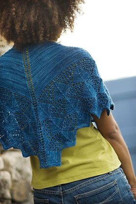 Solan (gannet): gannets gather in large numbers on the cliffs in Shetland, circling around for the perfect spot to fold up their wings and dive arrow-like into the depths of the North Sea. The defined V shapes and deep blue colour of this shawl reminded me of these graceful Shetland residents.