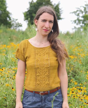 The Solstice Top is a joyful garment with some sweet details: a rolling edge at the neckline, slightly puffed sleeves against drop shoulders and a lace panel embellished with bobbles. With its loose fit and top-down construction that allows the knitter to make either a long top or a cropped one, this simple tee is flattering on bodies of all shapes and sizes.