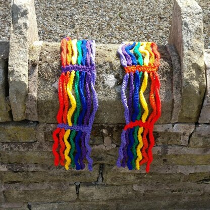 It uses DK yarn, held double, in seven colours, to make a rainbow. It is very easy to change the number of colours, and the spacing of the bars, to make a completely unique scarf. You will need very small amounts of yarn so it is ideal for using up oddments.