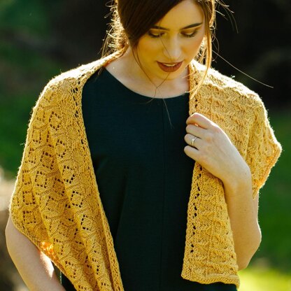 I love long shawls, but they can be a little hard to manage, so the shaping makes this easy to wear long, or wrapped. Note how the Arrowhead lace is used in a large stitch multiple along one long edge, as a part of the main body, then in a smaller stitch multiple to finish the top edge. I love to "see what's inside" stitch patterns, and the vertical borders came from the Slip Stitch Cable.