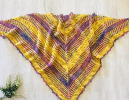 This shawl is perfect for using one of those beautiful hand dyed skeins of sock yarn that you loved, and purchased without a project in mind. Just pair it with a solid color that complements some of the colors in the multi-colored yarn, or use a contrasting color that creates a vibrant “happy” effect (as I did in the sample.) The striping effect fades the colors together, but also allows for sections of single color to shine in all its beauty. It is best to use the solid color as your MC, for working the lace sections, and variegated or speckled yarn as a CC. The shawl is completely reversible. The right side will look more striped, and the wrong side, more faded. Both are beautiful!