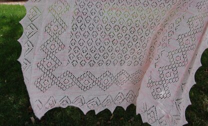 This is a traditionally constructed Estonian shawl. The body is worked first on the smaller needles with a border. The edging is knitted next on the larger needles and then sewn on by hand.