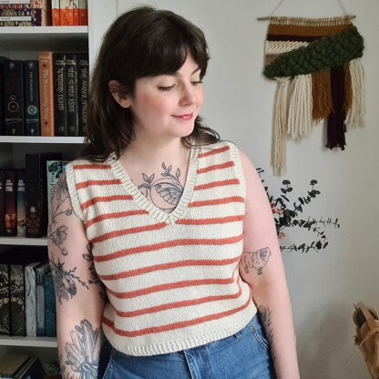 Sophorine is a versatile top which can be worked with short set-in sleeves or as a sleeveless top. It features a V-neck and options to work texture, colour stripes, or mix both. It's a straightforward project with simple details, a canvas for creative summer garments.