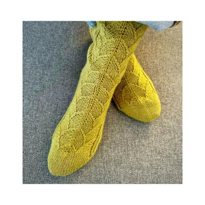 Die Socken SOUND OF LEAVES werden von oben nach unten in Runden gestrickt. Das Bündchen hat eine 1 x 1 - Rippe. Über die Vorderseite verläuft ein Musterband.