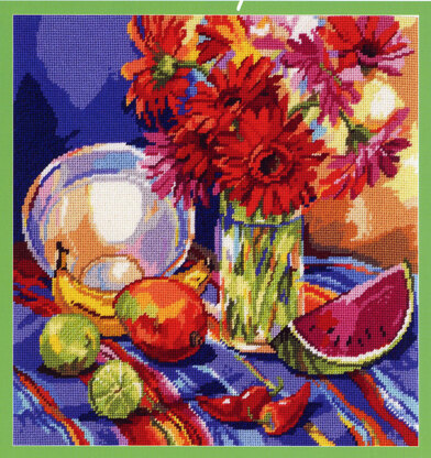 Designed by: Nancy Rossi. South of the border flavor bursts forth with brilliant hot and cool colors. The cool blue background and the ethnic patterned tablecloth compliment the hot colors of the gerbera daisies and tropical watermelon, mango, lime, banana and chili peppers. This painterly still life by Nancy Rossi is a delight.